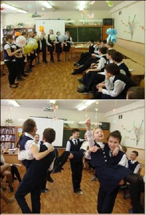 Девочки подготовили не только необычные подарки, но и конкурсную программу, включив силовые задания: отжимания, приседания и другие. Но больше всего девочкам из 6А (классный руководитель Юсупова О.Н.) понравилось, как мальчики носили их на руках.