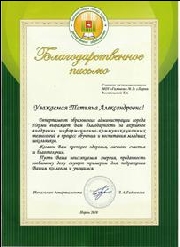 Департамент образования администрации города Перми выражает БЛАГОДАРНОСТЬ ВОСТРЕЦОВОЙ ТАТЬЯНА АЛЕКСАНДРОВНЕ, учителю информатики начальных классов, ЗА АКТИВНОЕ ВНЕДРЕНИЕ ИНФОРМАЦИОННО-КОММУНИКАЦИОННЫХ ТЕХНОЛОГИЙ в процесс обучения и воспитания младших школьников